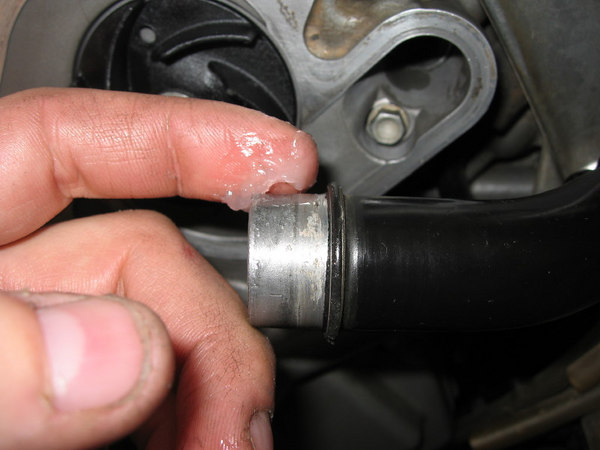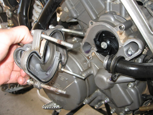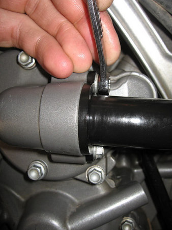 Fill the coolant system through the radiator cap until the radiator is full. This could take some time as the coolant has to slowly feed its way into the engine, so be patient. Once the radiator is full, remove the upper bleed screw in the water pump cover and bleed all the air out of the pump until fluid flows. Put the screw back and tighten.
