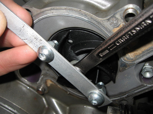 Unscrew the impeller bolt without applying a turning force through the pump drive mechanism. Apply the same force on the tool you have just made but in the opposing direction to the wrench.