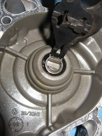 Flip the cover over and install the remaining small circlip on the inner edge of the pump shaft.