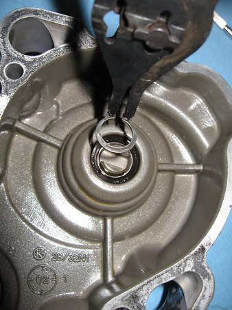 Take note that the housing holds two identical bearings and each only have seals on one side. The inner most bearing (first image) has the seal facing into the engine, the outer most bearing (second image) has the seal facing outwards. The bearing both exit through the outer face of the cover. In-between the bearings there is a circlip so you have to remove the first bearing and then the circlip before you remove the second bearing. Do not try to remove them both together. All three circlips within the pump shaft system are there to locate the axial position of the water pump shaft and prevent it from drifting side to side under operation.