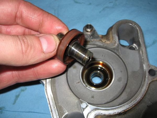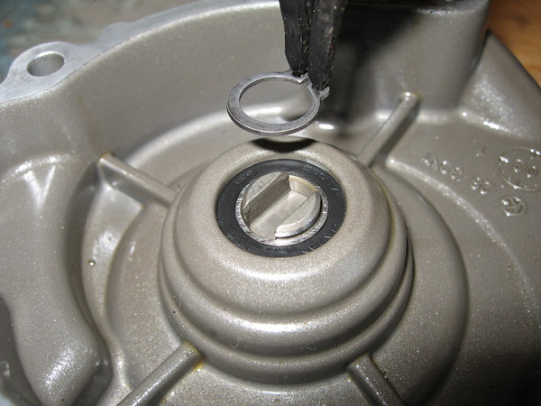 Now remove the seal from the outer side of the cover. This is not all that easy so I found it better just to punch the old shaft out from the inside which takes the seal with it as it has a circlip attached behind the seal.