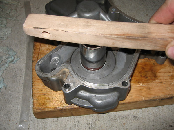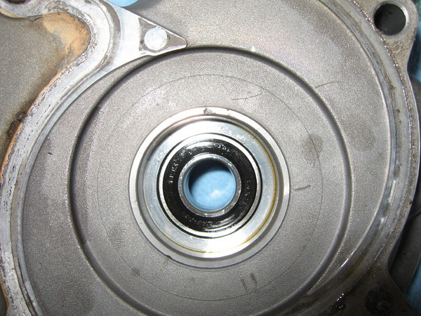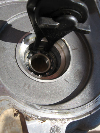 Then, install the outer bearing with the seal facing up or outwards from the engine in the same manner as you installed the first. Make sure it is fully up to the circlip.