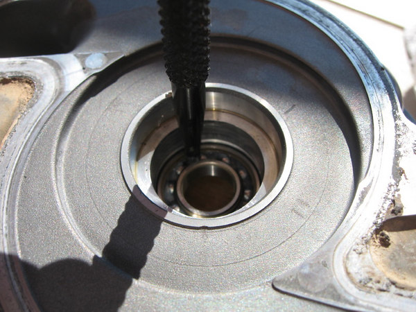 Quickly clean the bearing bores with some lint free cloth and retrieve the new bearings from the freezer. Install the first bearing (seal side down or facing inwards towards the engine) by gently taping it evenly around the circumference of the outer race as to not get it jammed (be careful not to slip and damage the bearing). Once it gets square it should slide in freely. Ensure it is fully to the bottom of the housing.