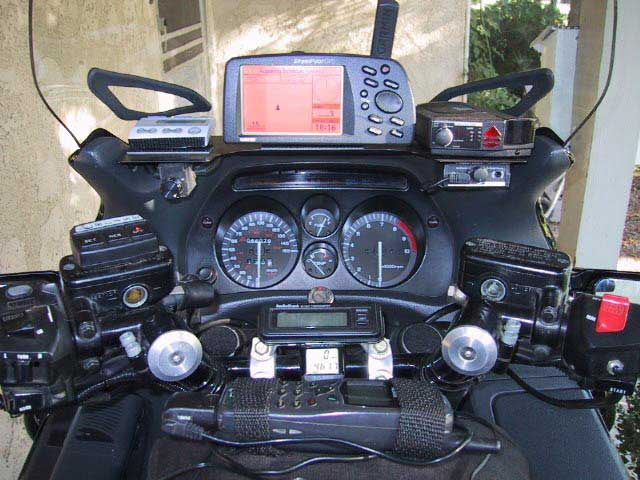 One Radar Locator. Under the shelf on the left is a Widder electronic heat control for the heated grips. Under the right side of the shelf is a remote audio
