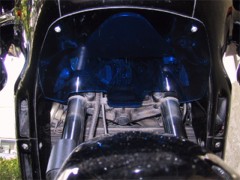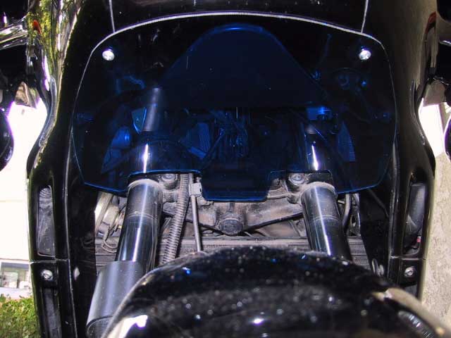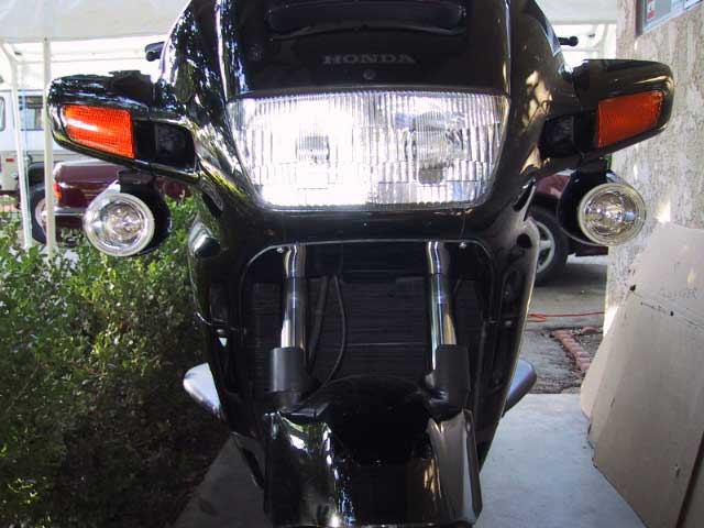The image to the left shows the S.T.E.F.i. plate from the wind's eye view. Also, the PIAA 910 driving lights on Ron Major brackets are visible. The 910's have PIAA Xtra bright 85w H-3's in them. The headlight has been modified with a dual un-shielded HID conversion. I have described this farkle thoroughly at http://www.johnandbecci.com/Hints/HID.htm